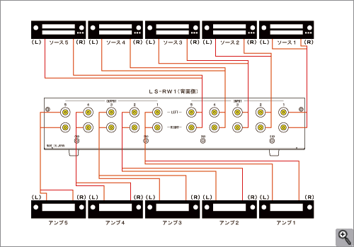| 接続例 入力:ソース機器5台、出力:アンプ5台 |