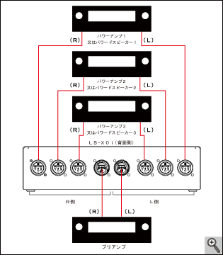 接続例 入力:プリアンプ1台、 出力:パワーアンプ3台 又はパワードスピーカー3台 |