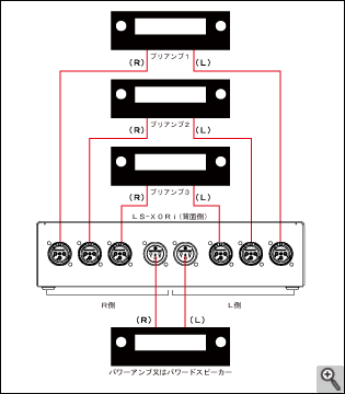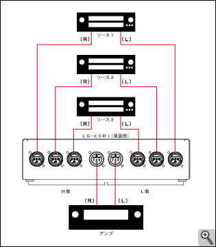 | 接続例 入力:ソース機器3台、出力:アンプ1台 |