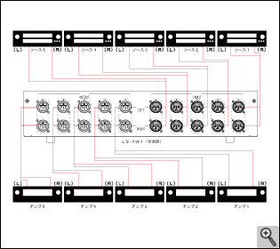 | 接続例 入力:ソース機器5台、出力:アンプ5台 |