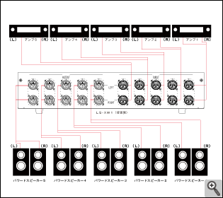 接続例 入力:プリアンプ5台、出力:パワードスピーカー5台 |