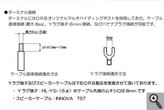 | ターミナルにはORBオリジナルマルチバイディングポストを採用しており、ケーブル直接接続(最大8sq)、Yラグ端子(6mm)接続、及びバナナプラグ接続が可能です。 | ![]() |