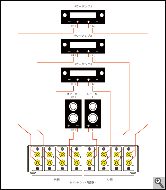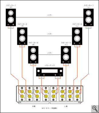 | (1)バインディングポストCOMにパワーアンプを接続します。 (2)バインディングポスト1~3に3組のスピーカーを接続します。 ※L/R 及び +極(赤色)-極(黒色)を間違えないよう接続して下さい。 |