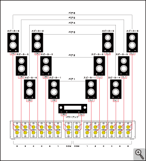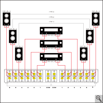 | (1)バインディングポストCOMにパワーアンプを1台接続します。 (2)バインディングポスト1~6に6組のスピーカーを接続します。 または、バインディングポスト1~3に3組のメインスピーカーを接続し、4~6に3組のツイーターを接続します。 ※L/R及び、+極(赤色)-極(黒色)を間違えないよう接続して下さい。 |