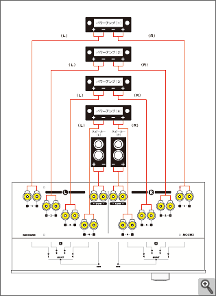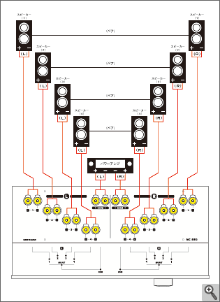 | (1)入出力端子COMにアンプを接続します。 (2)入出力端子1~4に最大4組のスピーカーを接続します。 ※L/R 及び +極(赤色)-極(黒色)を間違えないよう接続して下さい。 |