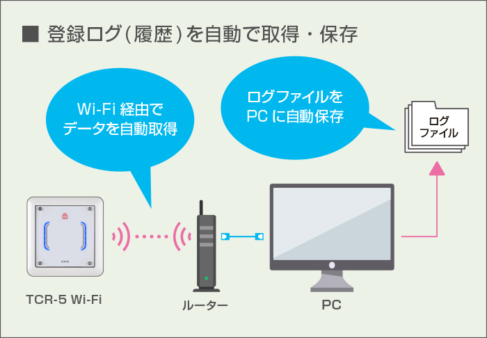 ログは正確な時刻と共に記録されます。ログの確認やカードの登録はWi-Fi経由で行うため、複数のドアでの運用も効率よく行えます。またカードリーダー本体とPC間での配線工事が不要であるため、短い工期で導入できます。